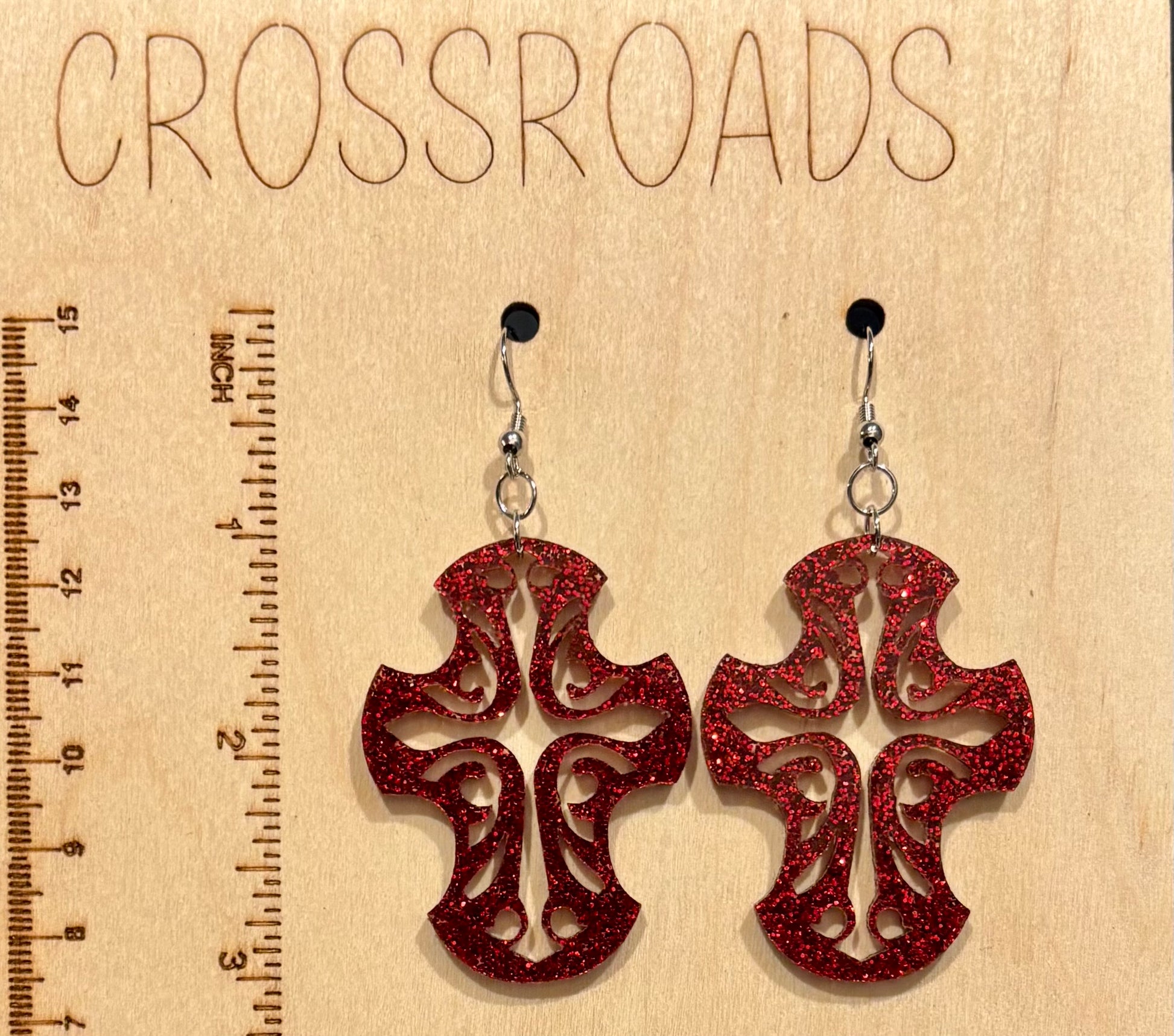 Cross Acrylic Earrings, Red Glitter