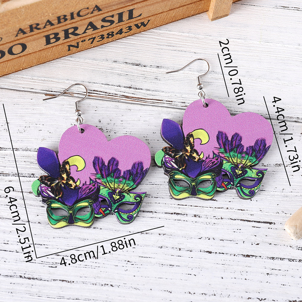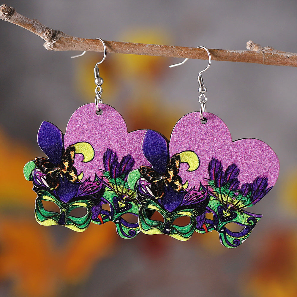 Mardi Gras "Purple Heart w/Masks" Wood Earrings